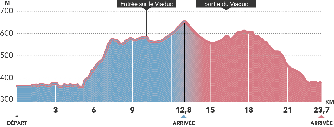Pour ce nouveau parcours, tout commence exactement comme sur le tracé de 23,7 km…seule différence : une fois la traversée aller de l’ouvrage effectuée, c’est la ligne d’arrivée qui attend les coureurs, qui rejoignent ensuite le centre-ville de Millau grâce aux navettes.